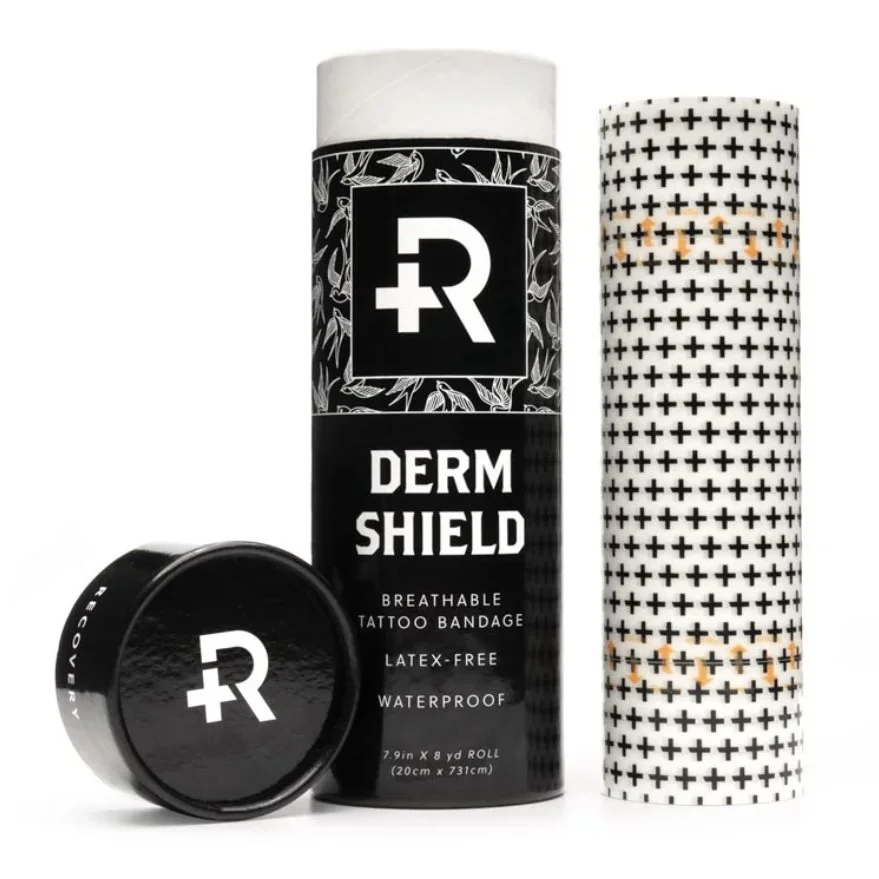 What makes Recovery Derm Shield better than others on the market? Recovery Derm Shield is a light, waterproof composite film bandage comprised of three layers: EVA film, matte PU film, and glassine. The matte PU film, which is the part of the bandage that remains on and protects the skin after tattooing, allows for optimal breathability and ductility when compared to glossy film bandages. Recovery Derm Shield bandages are also latex-free.